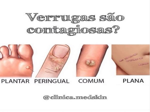 Basicamente classificamos as verrugas nos seguintes tipos: * vulgas ( é a mais comum e aparecem especialmente nas áreas expostas a maior atrito como mãos, dedos, cotovelos, joelhos e ao redor das unhas), *anogenital (podem ser precursoras de tumores malignos, como o câncer de colo de útero e de pênis),* plana, *filiforme, *plantar (pé), A grande maioria são indolores, exceto quando nos referimos as verrugas plantares que podem sangrar e causam dor, sendo confundidas com os calos.